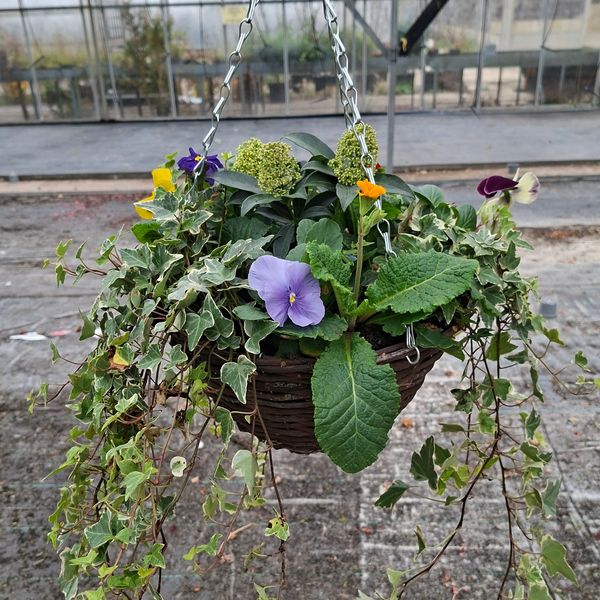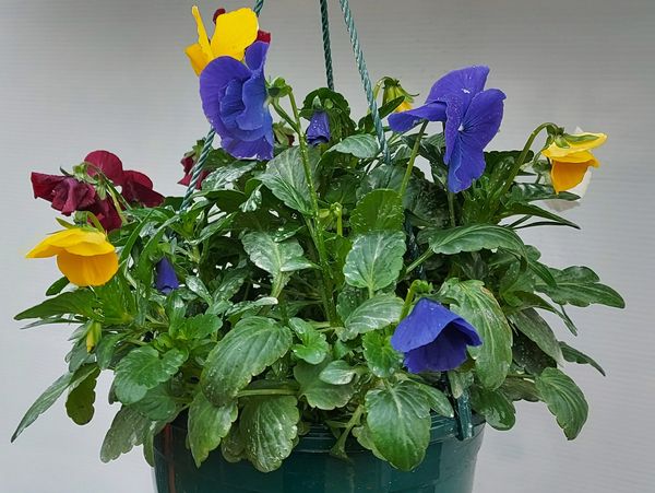 8" baskets planted with a mixed arrangement of winter flowering Pansy.