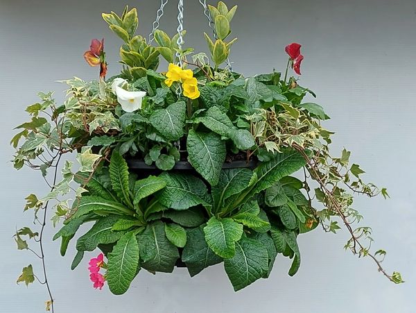 Planted with central evergreen shrub, best mix of bedding & trailing pansy, polyanthus and foliage.